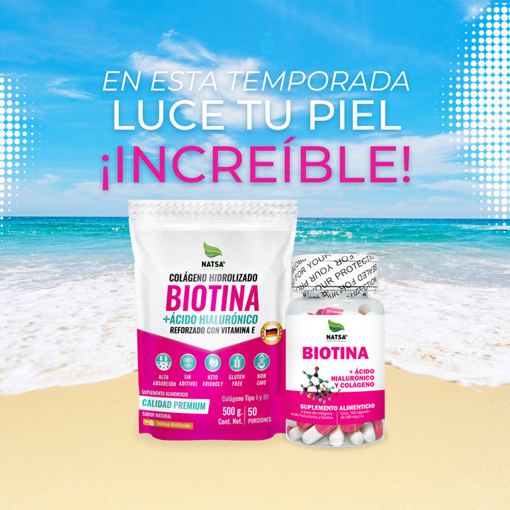BIOTINA con ÁCIDO HIALURÓNICO y COLÁGENO, tu fórmula completa para el cuidado de la piel, cabello y uñas, ofreciendote una opción de belleza integral.