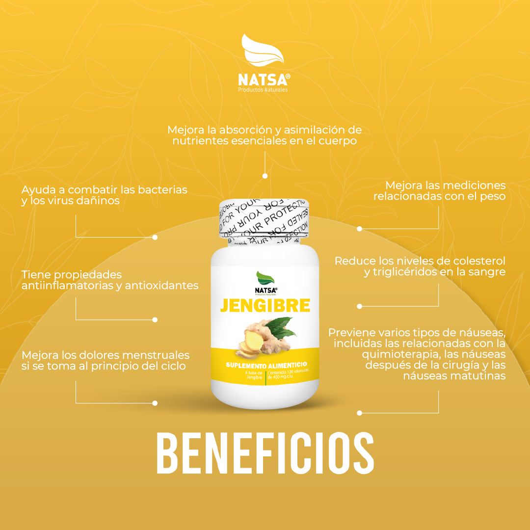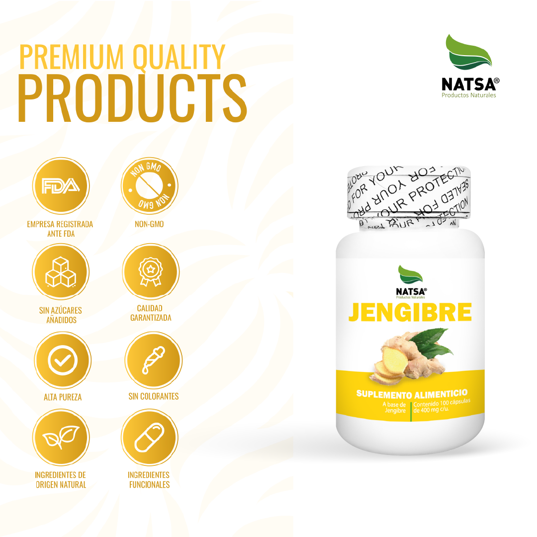 Conoce las cápsulas de Jengibre, un suplemento de calidad Premium con probados beneficios para la salud y bienestar. Producto natural que es libre de gluten y no contiene lactosa, por lo que es apto para personas con intolerancias alimentarias. Ideal para cuidar tu salud de manera natural.